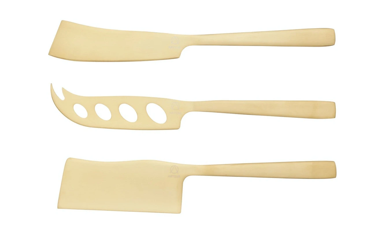 Bij een kaasplankje mogen de juiste kaasmesjes niet ontbreken natuurlijk. Met de Artesà Kaasmessenset 3-Delig haal jij leuke en trendy kaasmessen in huis. De messen zijn gemaakt van roestvrij staal en zijn afgewerkt met een wassing van glimmend messing. De messen zijn geschikt voor harde, halfharde en zachte kazen. Na het gebruiken van de Artesà Kaasmessenset 3-Delig kan deze eenvoudig worden gereinigd met de hand.