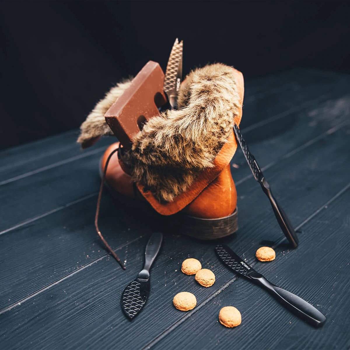 De Kaasmessenset Mini Monaco+ Zwart is uniek, stijlvol en geschikt voor elk type kaas. Serveer je een kaasplankje, dan hoort deze complete messenset daar absoluut bij! Extra handig: door de zwarte coating en het wafelpatroon zijn deze scherpe, roestvrijstalen messen non-stick.