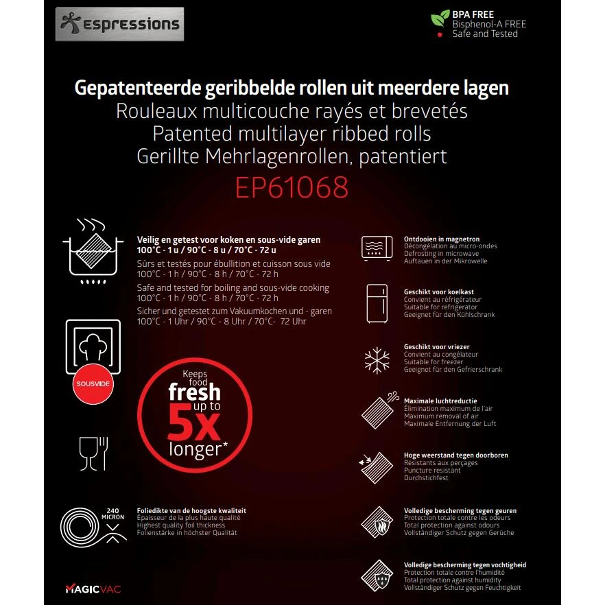 Garandeer dat er geen lucht of vocht meer bij je voedsel kan komen door te vacumeren met deze vacuumfolie van Espressions. Door te vacumeren kan je voedsel tot wel vijf keer langer bewaren en de smaken blijven behouden. Met de dikte van 240 micron zijn deze zakken van hoge kwaliteit en ze zijn BPA vrij. De formaten van dit folie is 30 bij 600 centimeter en het zijn 2 rollen. Ook geschikt voor sous vide koken! Let op: het sous vide koken is veilig en getest voor 100? voor 1 uur, 90? voor 8 uur, 70? voor 72 uur.