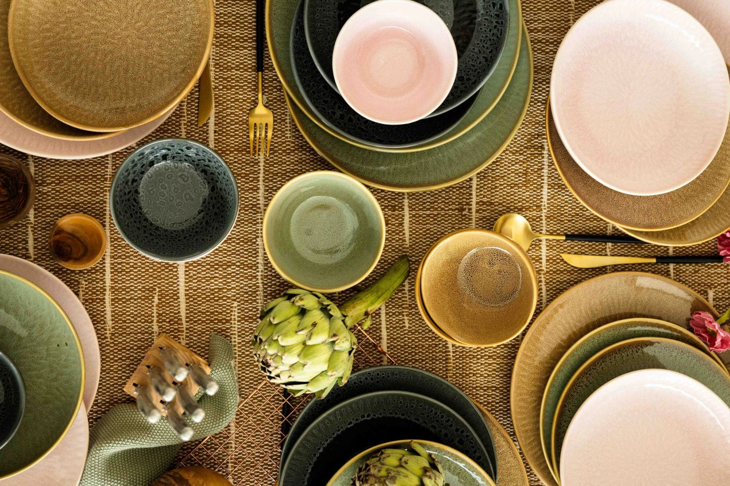 Het servies is afgewerkt met een ‘reactive glaze‘, ofwel reactief glazuur. Dit houdt in dat tijdens het bakproces van het servies een chemische reactie plaatsvind. Deze reactie zorgt ervoor dat elk item van het servies een eigen uniek kleurpatroon krijgt. Hierdoor ontstaan allemaal unieke borden, kommen en bekers. Groot is het verschil niet, het geheel past perfect bij elkaar!